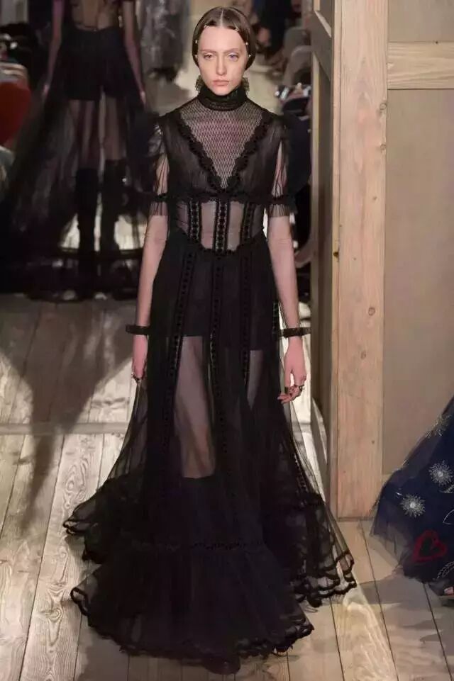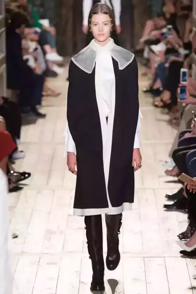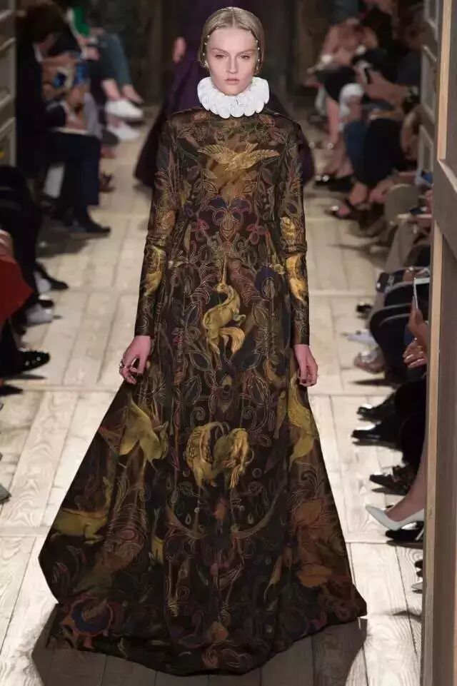 Valentino的设计师Pierpaolo Piccioli 和 Maria Grazia Chiuri 在设计上汲取了伊拉莎白一世时代服装的精致与华丽,以拉夫领、小高领、一字领贯穿整个系列,奠定了复古的基调。